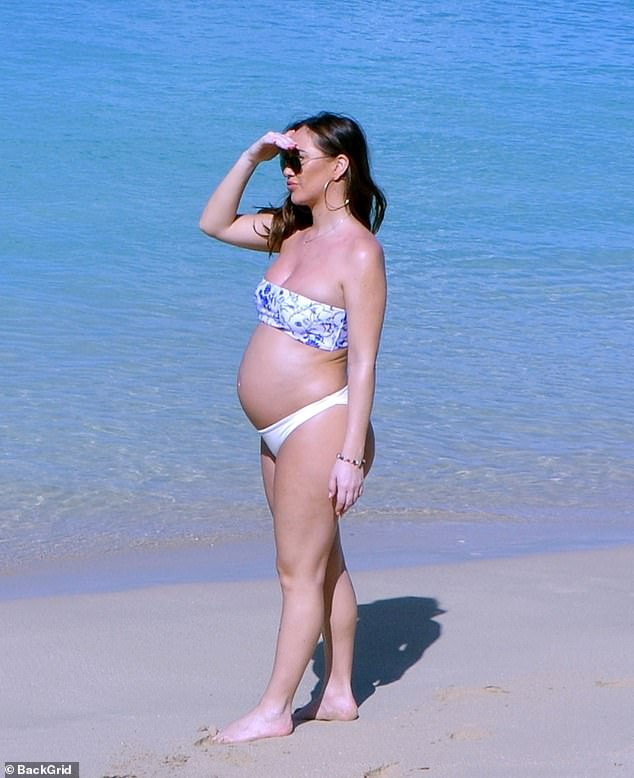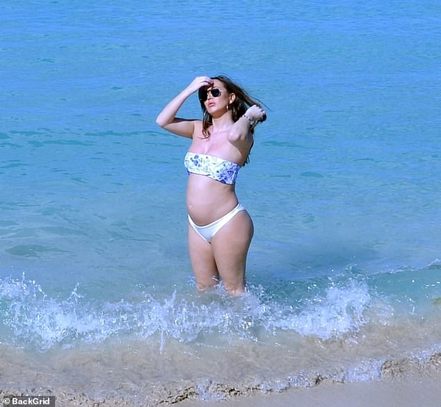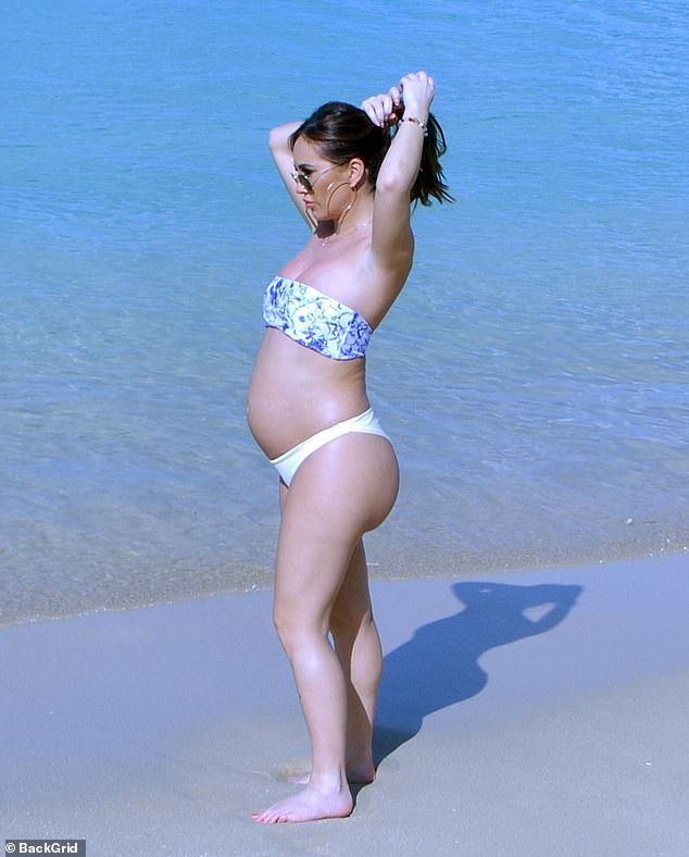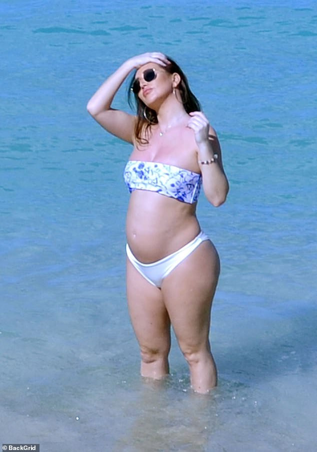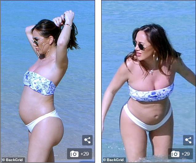 Cô mặc bikini hai mảnh dáng quây, với áo hoạ tiết xanh nền trắng và quần tam giác trắng khoe bụng bầu.