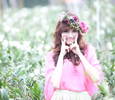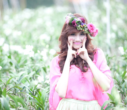 | Trang Nhung đẹp như một nàng công chúa với váy hồng và hoa đội đầu. |
