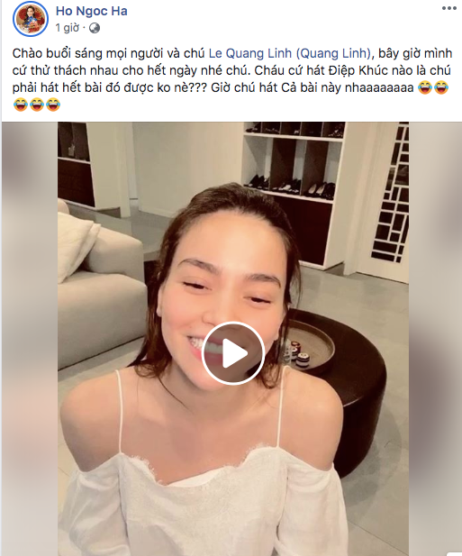 Mới đây, ca sĩ Hồ Ngọc Hà đăng tải video cô vừa đàn vừa thể hiện một đoạn ca khúc “Đừng yêu nữa, em mệt rồi” trên trang cá nhân kèm lời thách đố gửi tới ca sĩ Quang Linh. “Chào buổi sáng mọi người và chú Quang Linh, bây giờ mình cứ thử thách nhau cho hết ngày nhé chú. Cháu cứ hát điệp Khúc nào là chú phải hát hết bài đó được không nè? Giờ chú hát Cả bài này nha”.