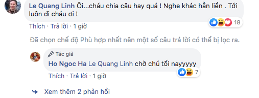 Đáp lại, ca sĩ Quang Linh dành lời khen ngợi: “ Ôi, cháu chia câu hay quá! Nghe khác hẳn liền. Tới luôn đi cháu ơi”. Trong khi Hồ Ngọc Hà chờ đợi màn thể hiện ca khúc này của đàn anh.