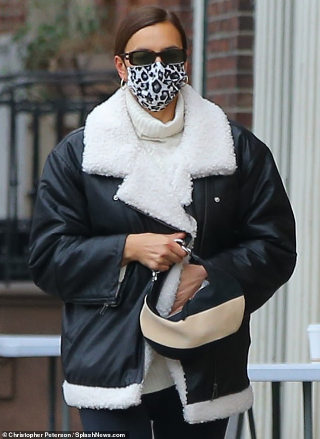Irina đeo khẩu trang đen trắng ton sur ton với trang phục.