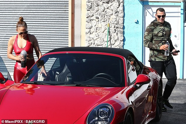 Jennifer Lopez diện trang phục màu đỏ rực bó sát đi tập gym ở Miami.