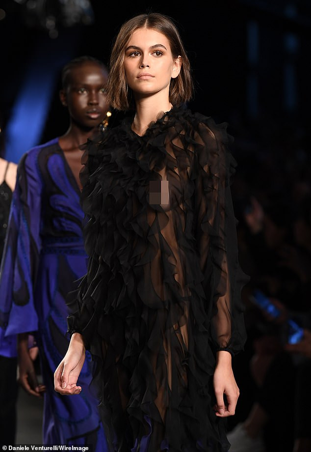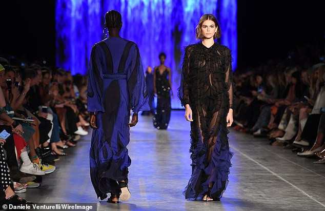 Kaia Gerber gây ấn tượng mạnh với bộ váy dài đen mỏng tang, với những đường bèo nhún chạy dọc từ cổ xuống chân váy.