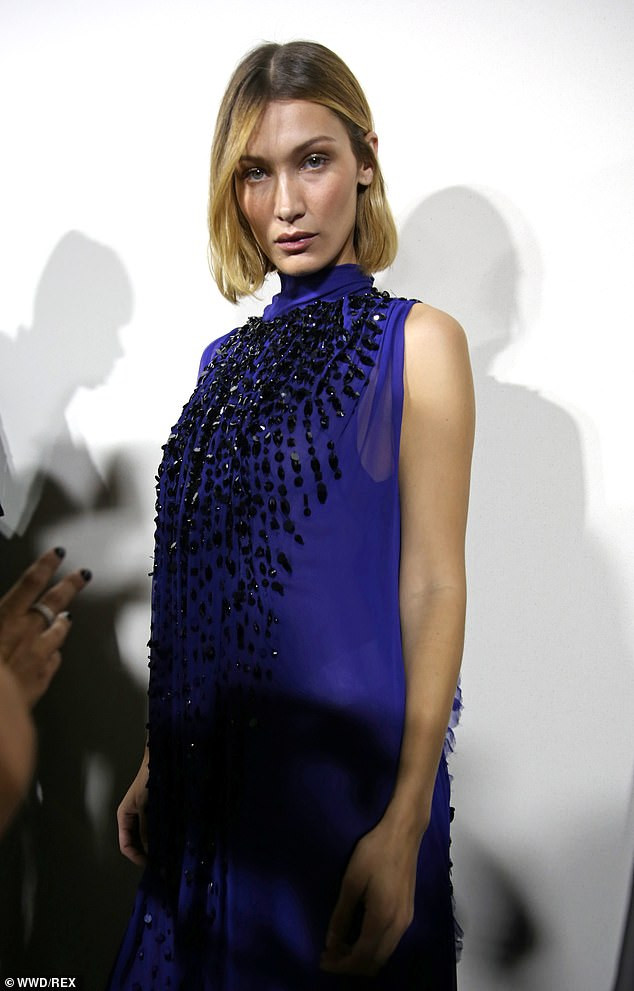 Trong khi đó, Bella Hadid kín đáo hơn với váy voan maxi màu xanh.