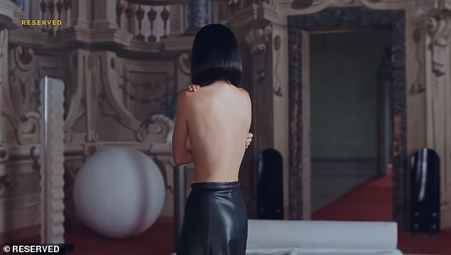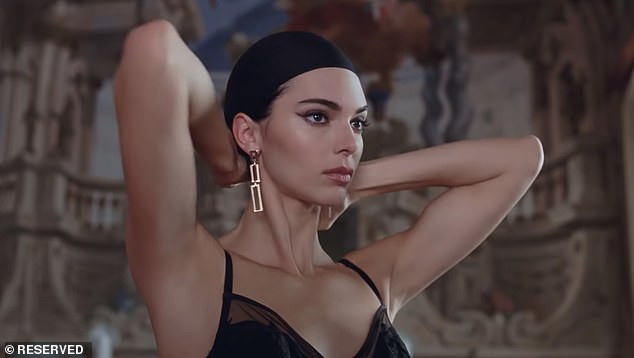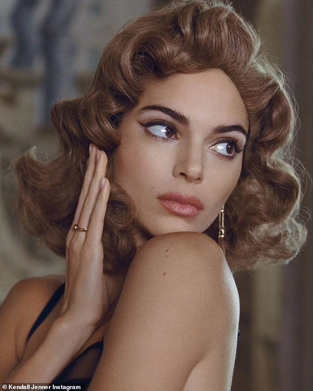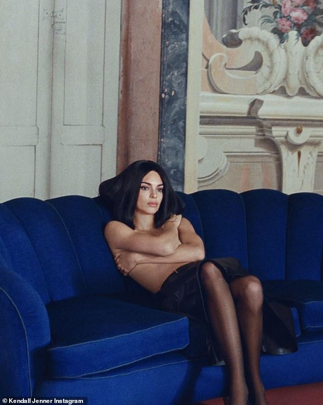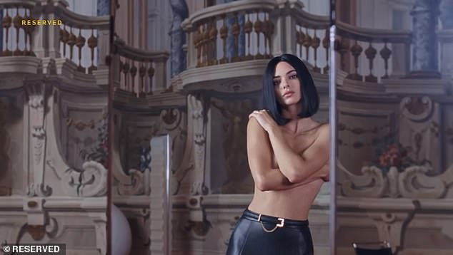 Trong loạt ảnh quảng cáo mới của Reversed, Kendall Jenner đội tóc giả ngắn ngang vai, hững hờ bán nude che ngực trần.