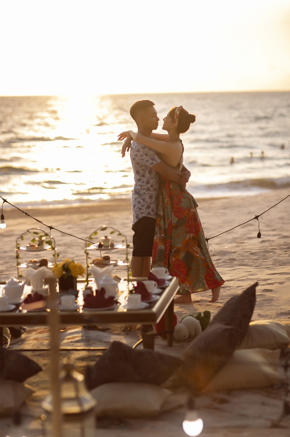 Khánh Thi cũng thổ lộ thêm, bữa tiệc trà chiều trên biển có ý nghĩa tinh thần lớn với vợ chồng cô và hai con. Khi hỏi về điều lãng mạn nhất Phan Hiển từng làm cho mình, ‘kiện tướng dance sport’ tiết lộ, đó là chiếc nhẫn kim cương trị giá gần 500 triệu.