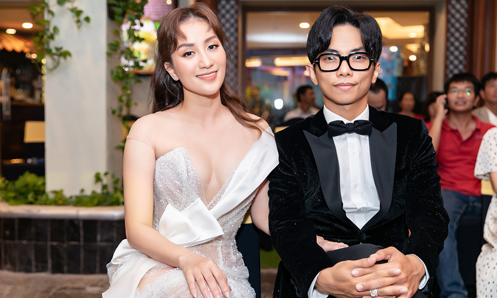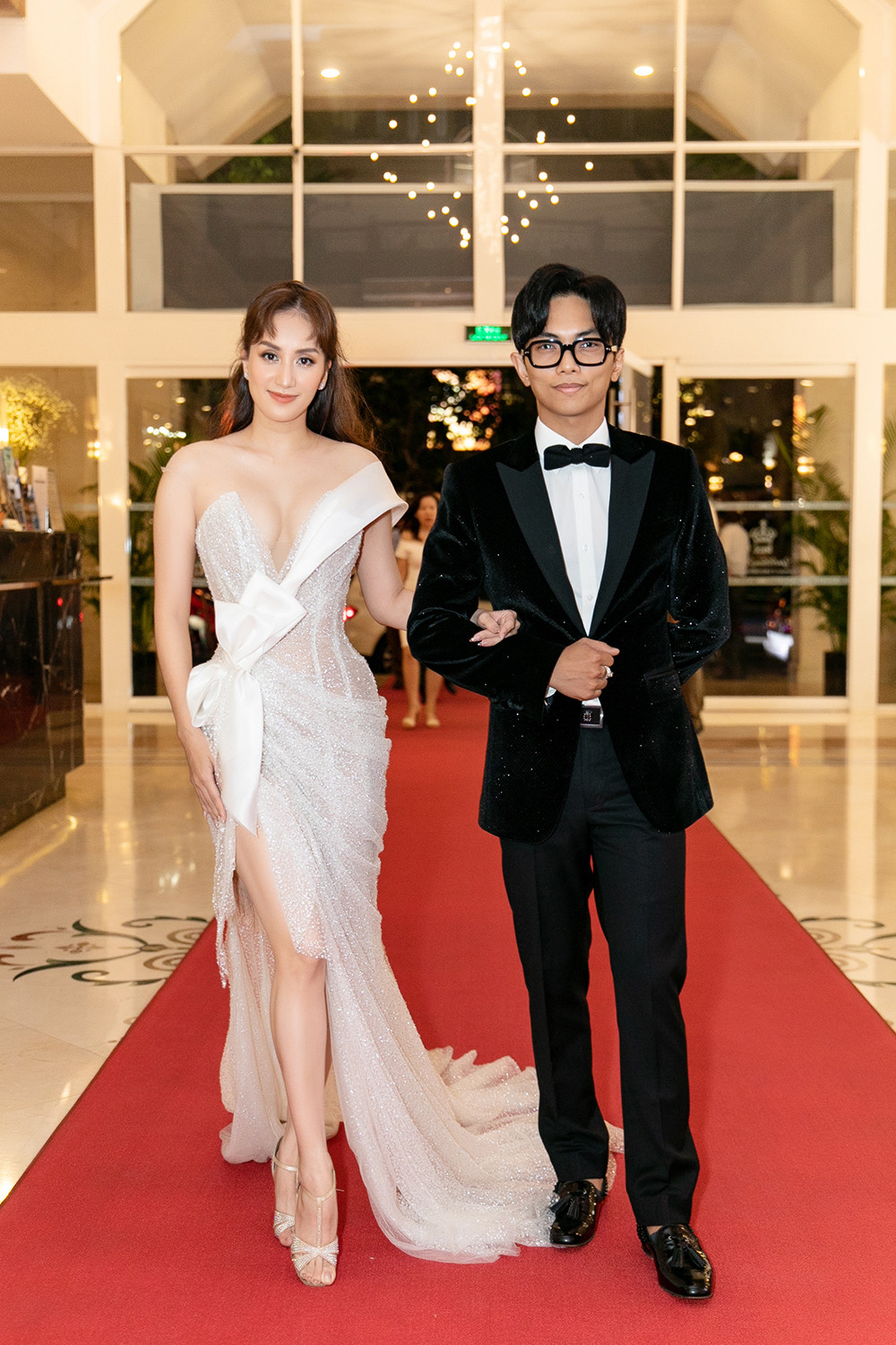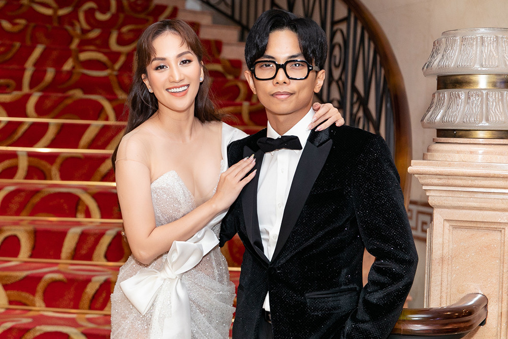 Khánh Thi diện đầm dạ hội lộng lẫy của NTK Anh Thư kết hợp với đôi bông tai kim cương trị giá vài trăm triệu do ông xã tặng vào dịp 8/3 năm ngoái, trong khi đó Phan Hiển chọn bộ tuxedo lịch lãm.