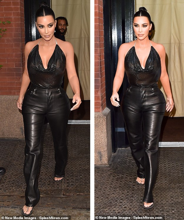 Kim mặc nguyên "cây" đen, với áo yếm sequin, quần da ống đứng, dép tông cao gót, phô bày thân hình "đồng hồ cát" trứ danh.