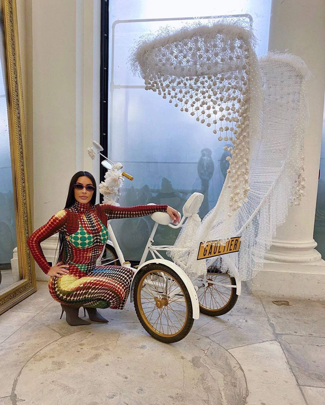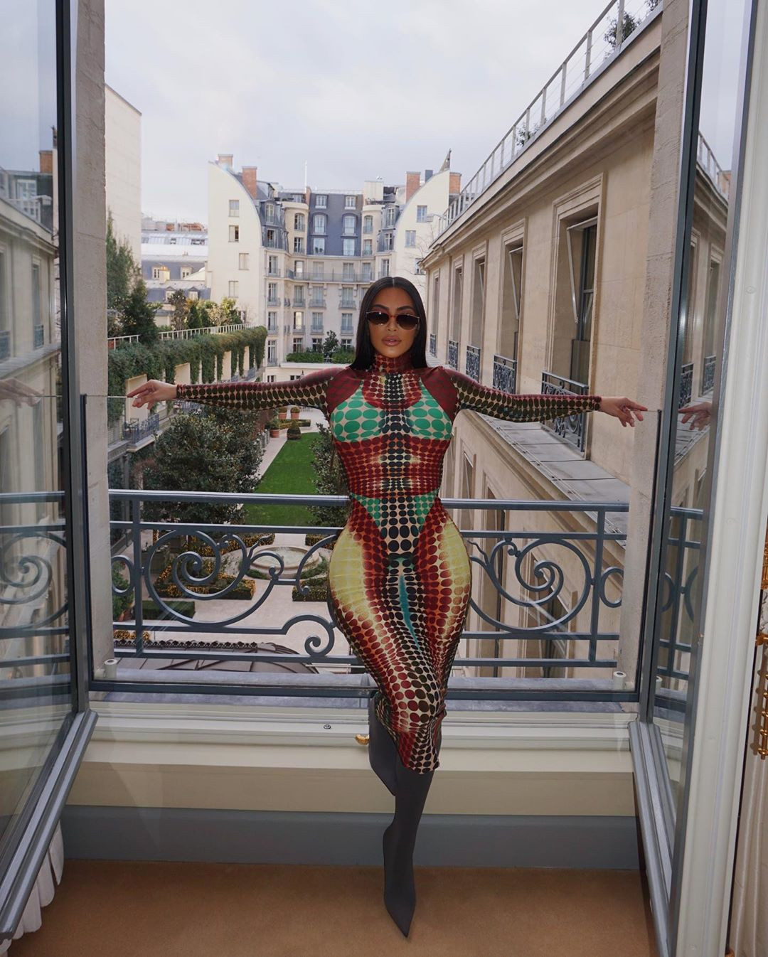 Trong loạt ảnh mới, Kim Kardashian dù mặc kín bưng vẫn rất ấn tượng với bộ váy dài họa tiết bikini.