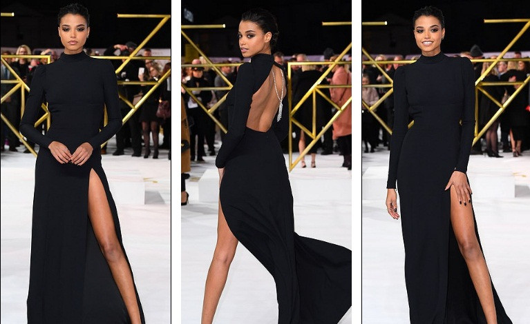 Nữ diễn viên người Anh Ella Balinska diện đầm đen xẻ cao bất tận. Cô đóng vai Jane Kano cũng là một trong những thiên thần của Charlie.