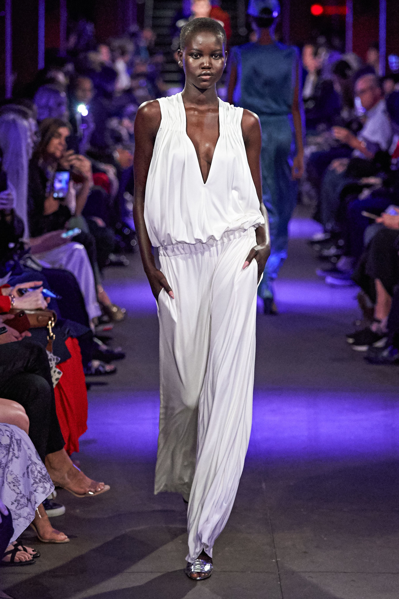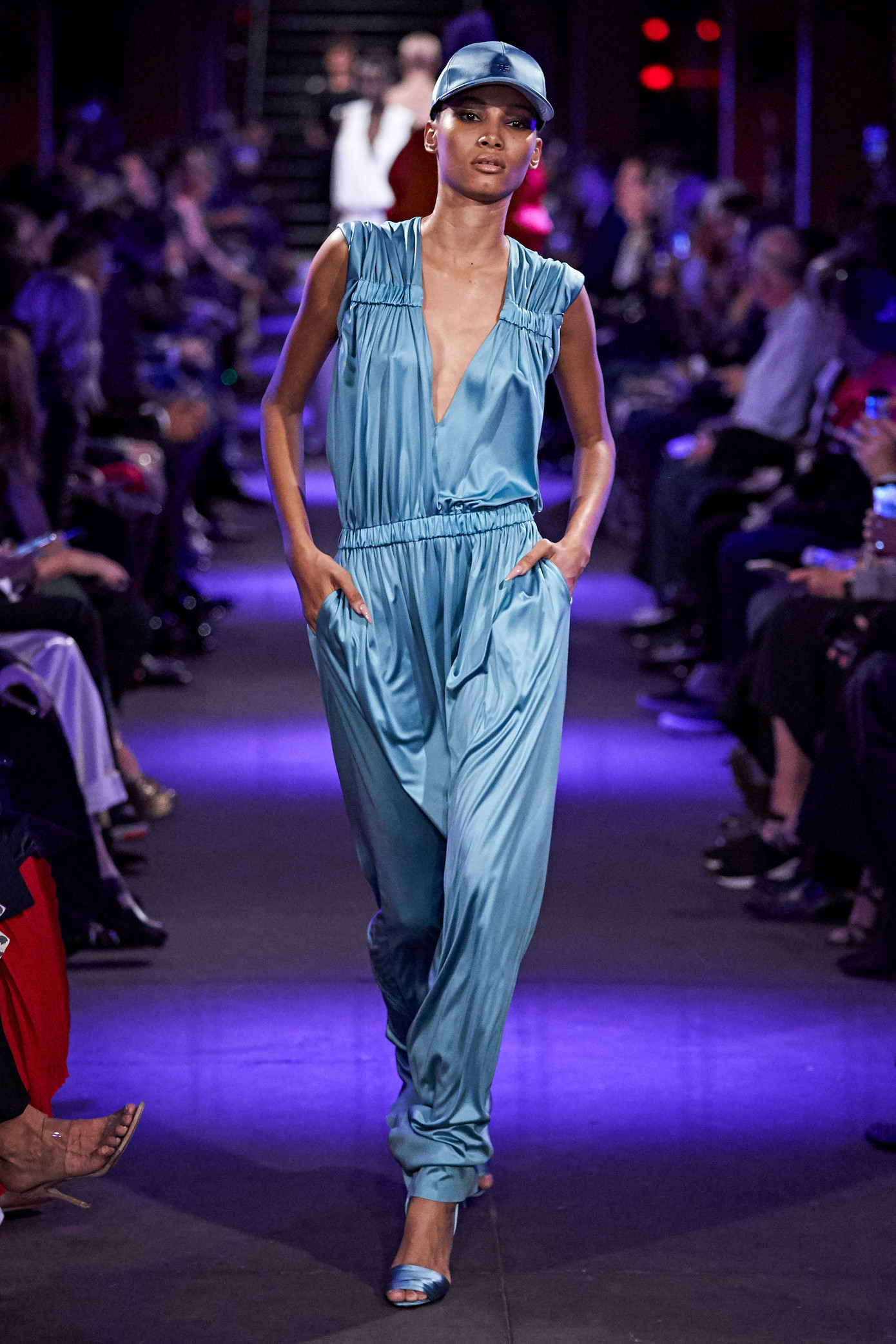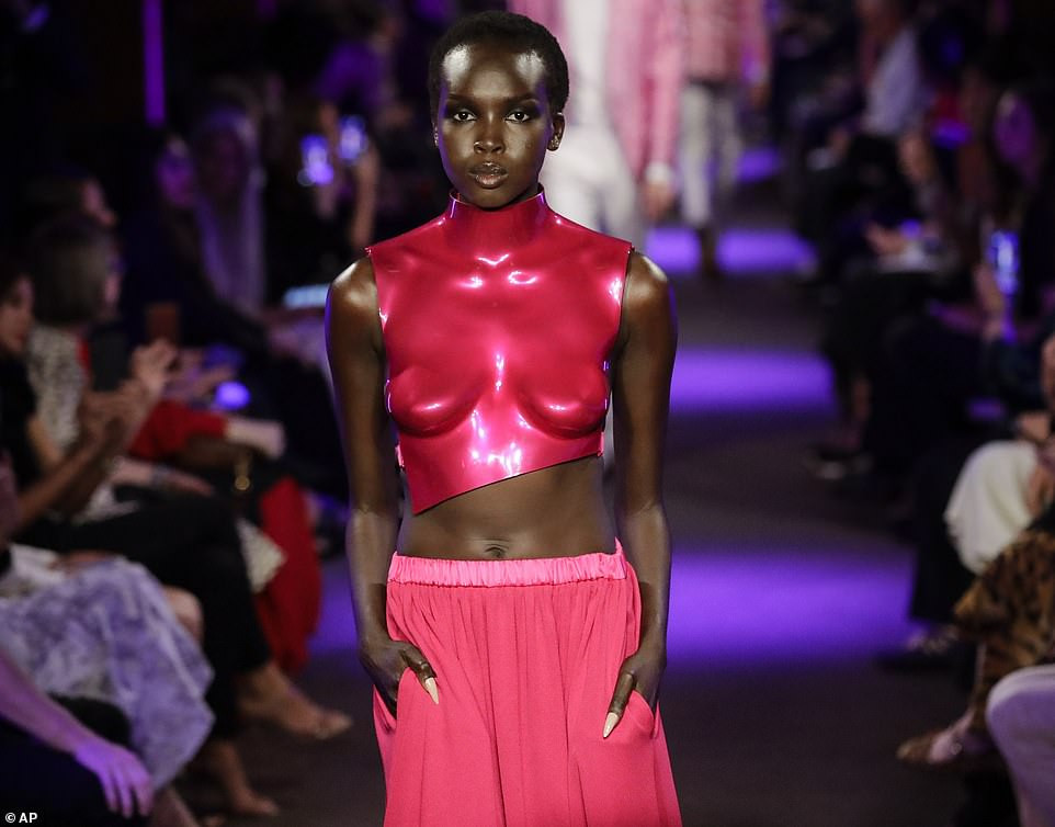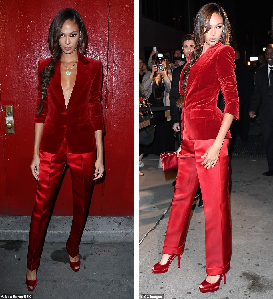 Siêu mẫu Joan Smalls nổi bật với áo vest da lộn "không nội y", quần satin xếp li và giày cao gót màu đỏ.
