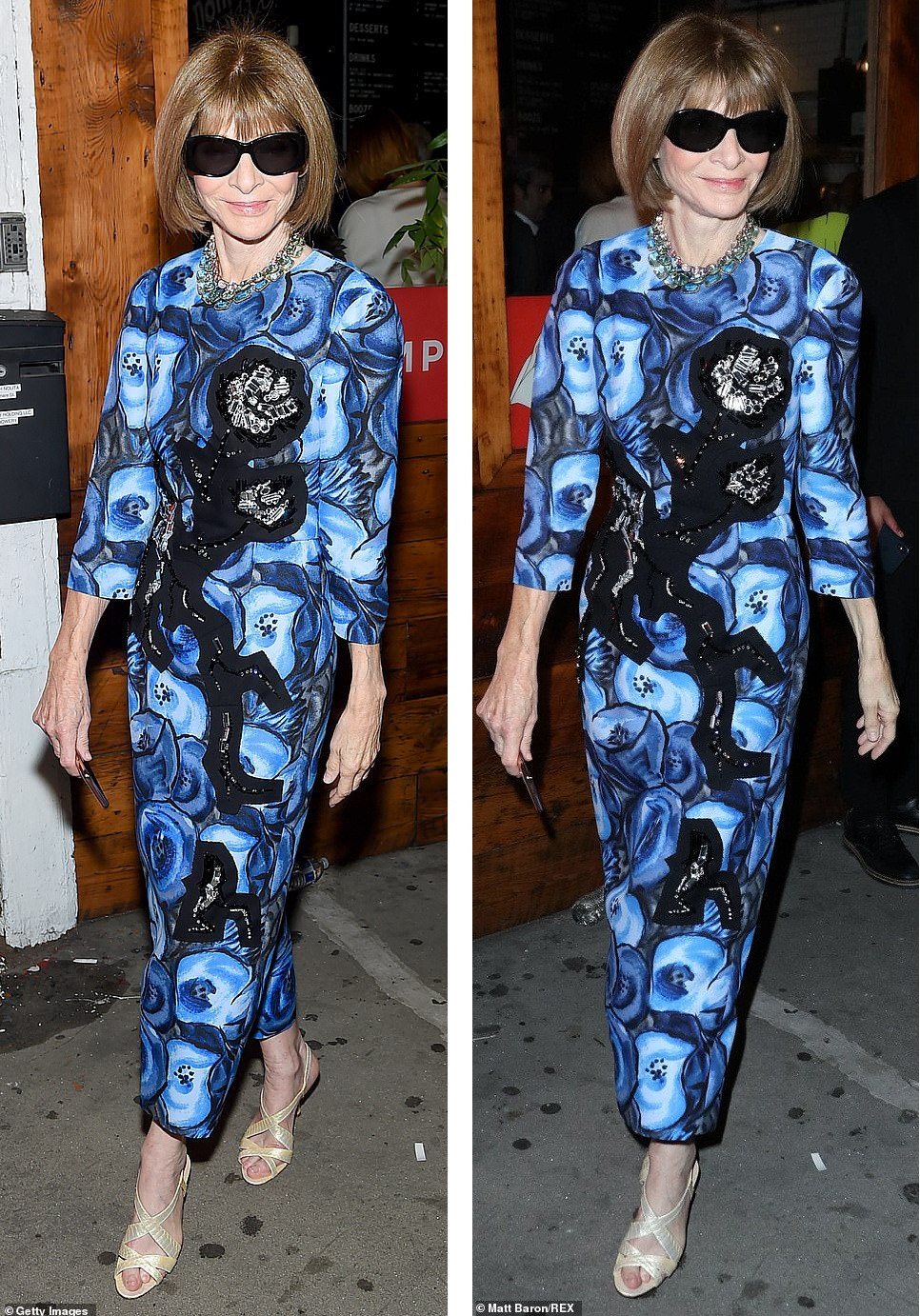 Tổng biên tập Vogue Anna Wintour sang trọng trong đầm dài hoạ tiết màu xanh.