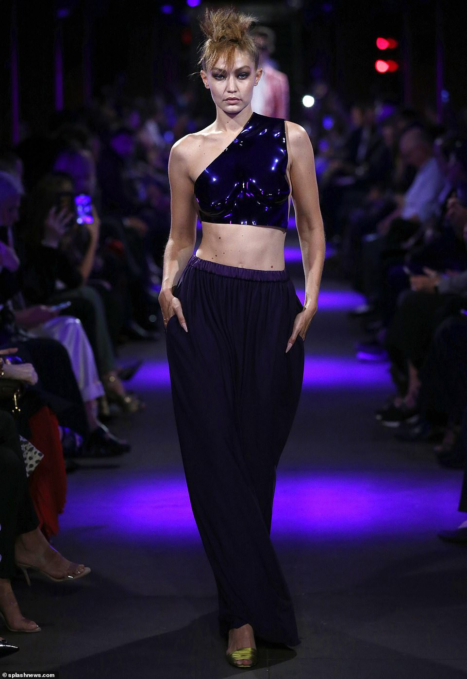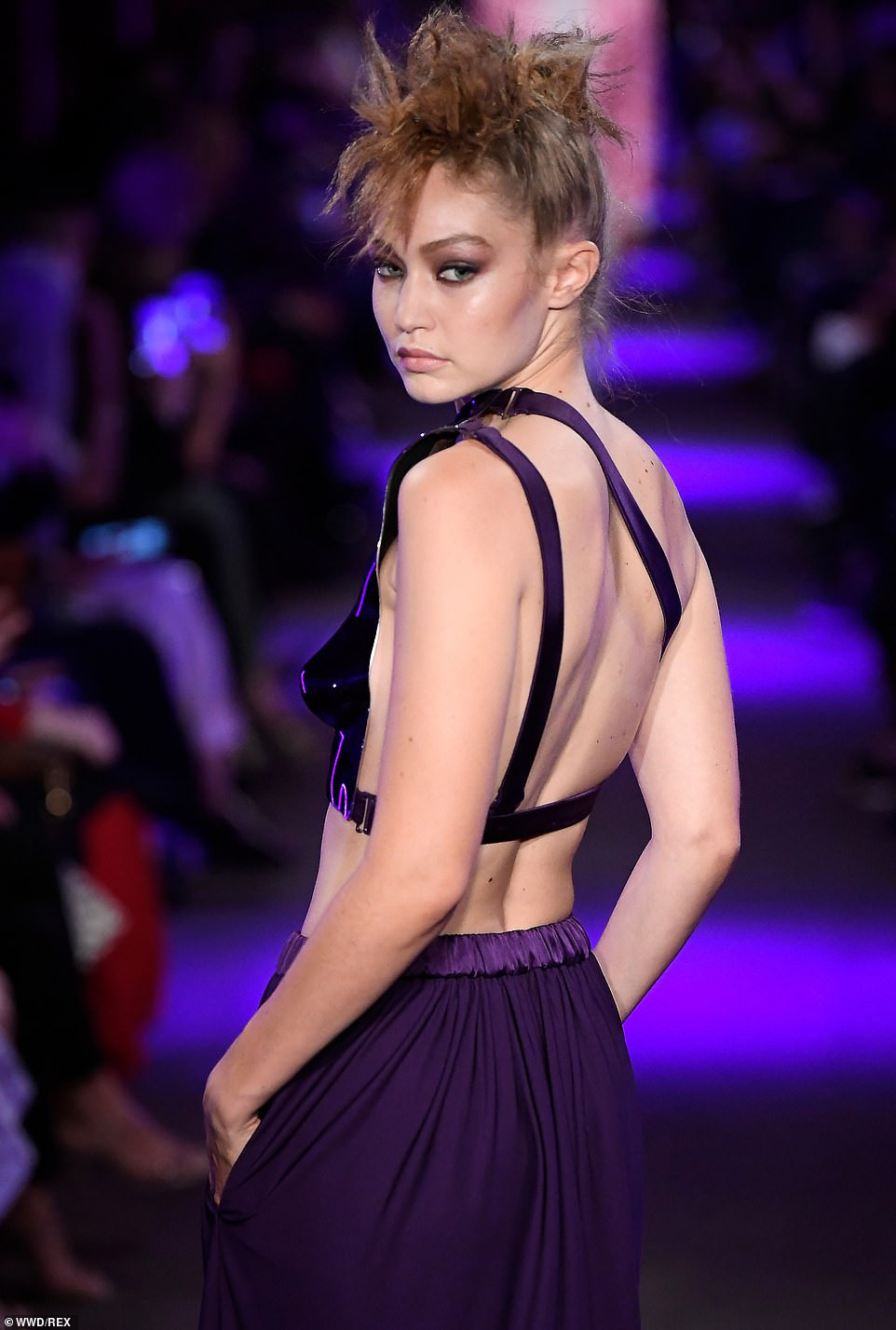 Một trong những gương mặt người mẫu gây chú ý trong show diễn là Gigi Hadid. "Chân dài" 24 tuổi trình diễn set đồ gồm áo crop-top lệch vai, bó sát người làm từ chất liệu nhựa đúc và chân váy maxi màu tím, kết hợp giày cao gót hở mũi.