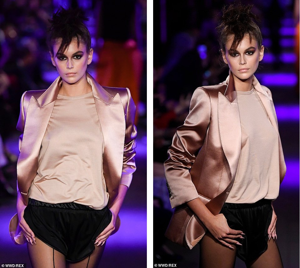 Kaia Gerber cũng tham gia trình diễn. Cô trông sắc lẹm với chiếc áo blazer màu hồng nhạt form rộng, áo trơn đồng màu mặc trong, quần short đen trơn, kết hợp tất quần đen và giày cao gót bằng vải satin màu xanh đen.