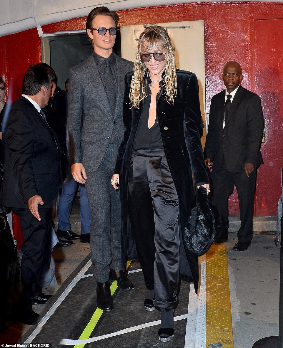 Bên cạnh người mẫu trình diễn, show thời trang Tom Ford còn có sự góp mặt của loạt sao hạng A như Miley Cyrus. Cô diện nguyên cây đen hoá thân thành ca/nhạc sĩ Kid Rock.
