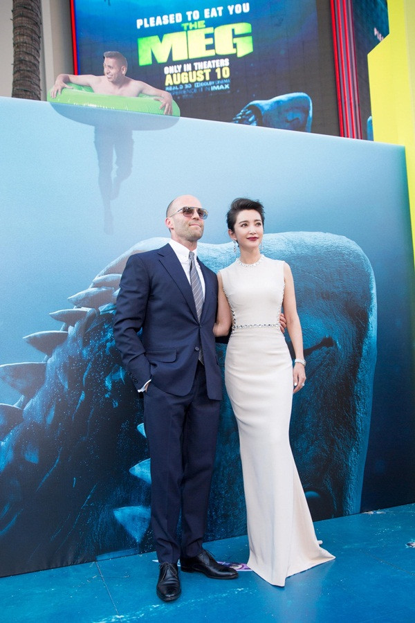 Lý Băng Băng diện đầm trắng ôm sát khoe đường cong hút mắt khi đến dự buổi công chiếu phim về đề tài cá mập "Meg" tại Los Angeles.