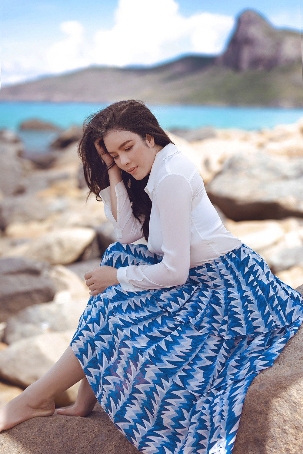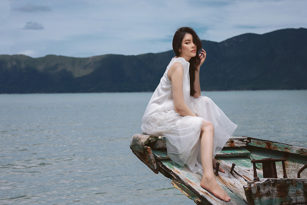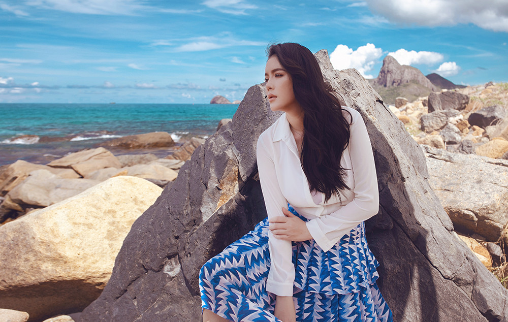Lý Nhã Kỳ trông quyến rũ hút hồn trước vẻ đẹp bao la của biển.