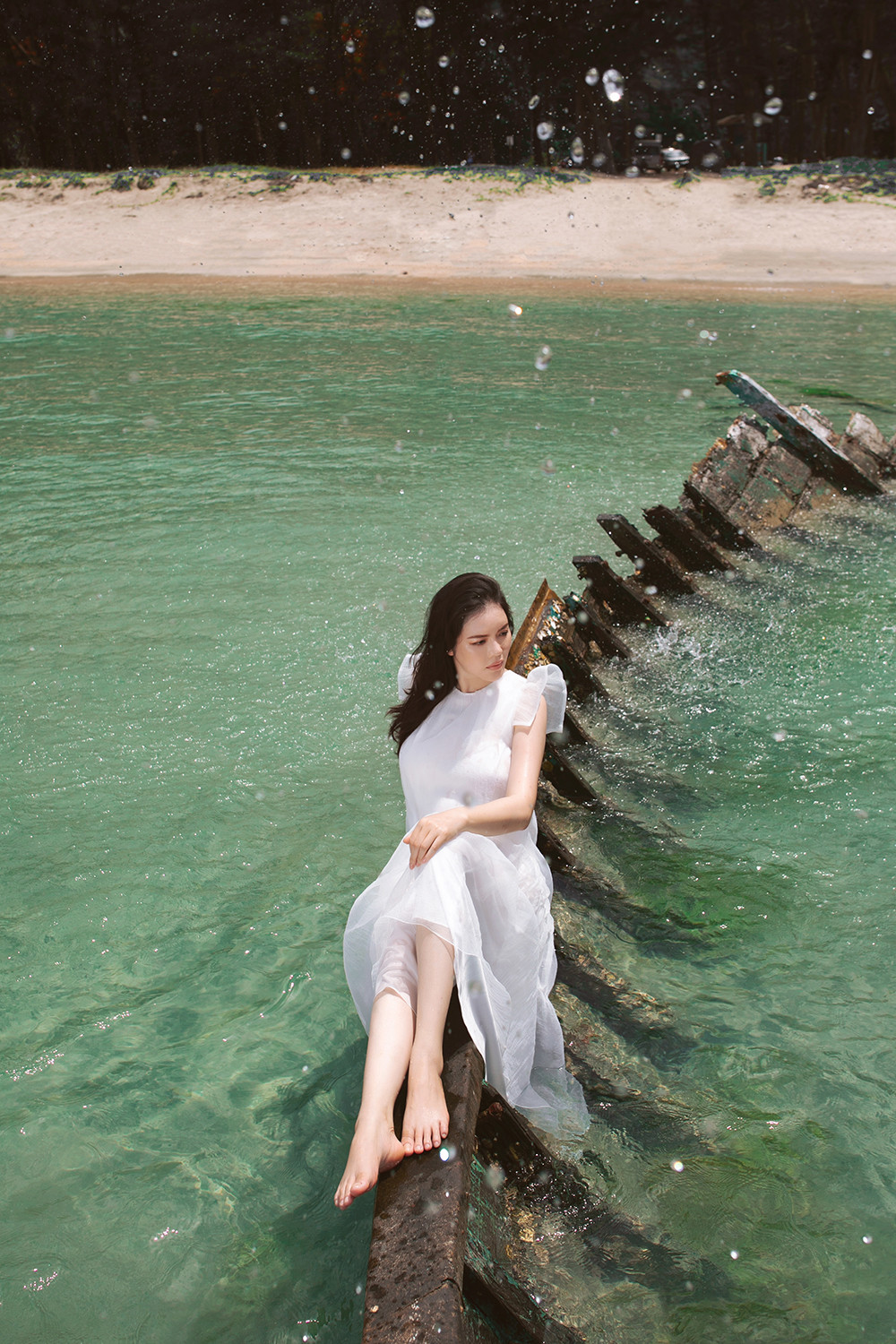 Váy trắng là lựa chọn hài hòa với cho bức ảnh chụp giữa sắc nước mênh mông, những tia nắng chói chang.