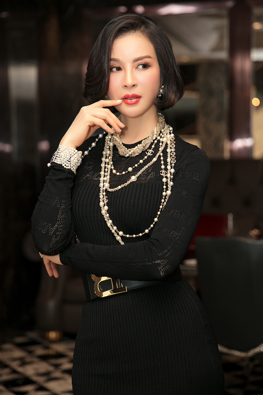 Cô kết hợp vòng cổ ngọc trai và họa tiết to bản để tạo điểm nhấn cho ngoại hình.