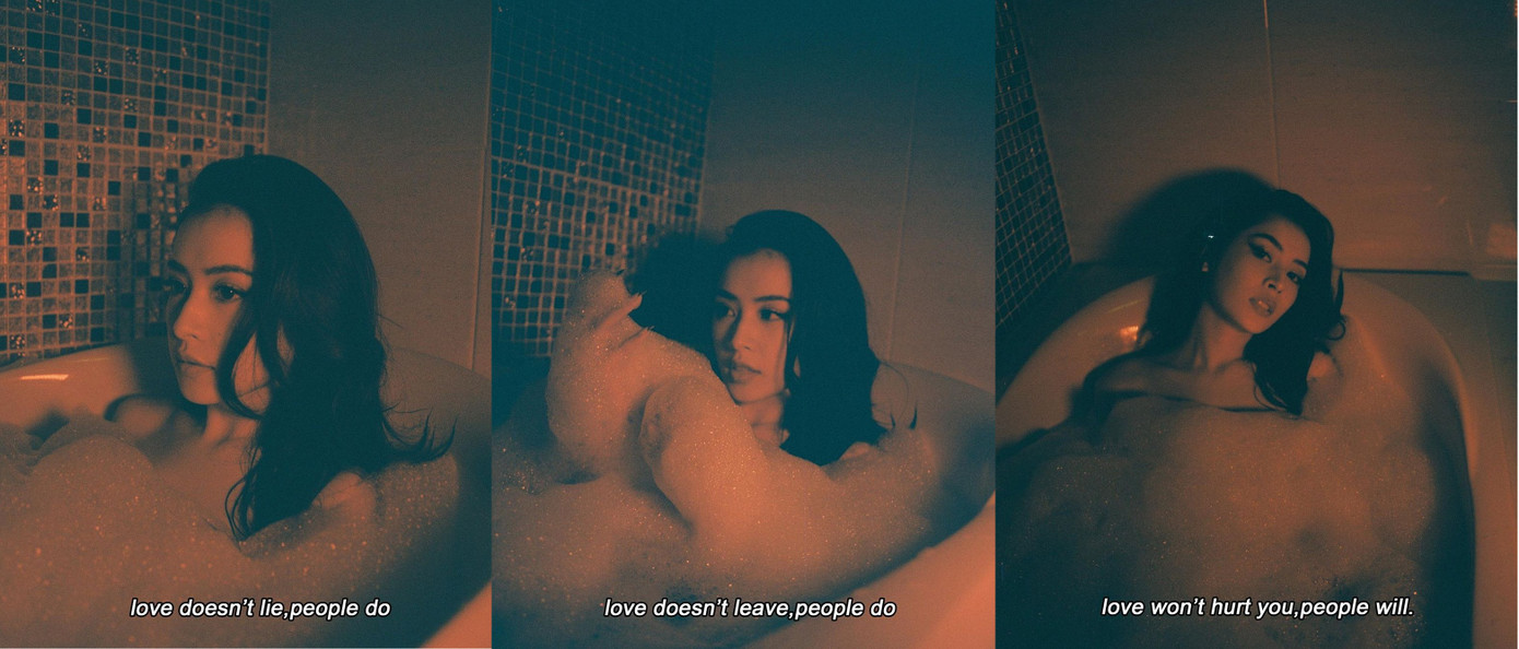 Táo bạo hơn hẳn nàng hoa khôi cùng tuổi, Chi Pu chụp ảnh "tự sướng" ngay trong bồn thắm với loạt câu đậm mùi "tâm trạng": "Tình yêu không nói dối, con người có", "Tình yêu không rời bỏ, con người có", "Tình yêu không tổn thương bạn, con người có". (từ trái qua phải).