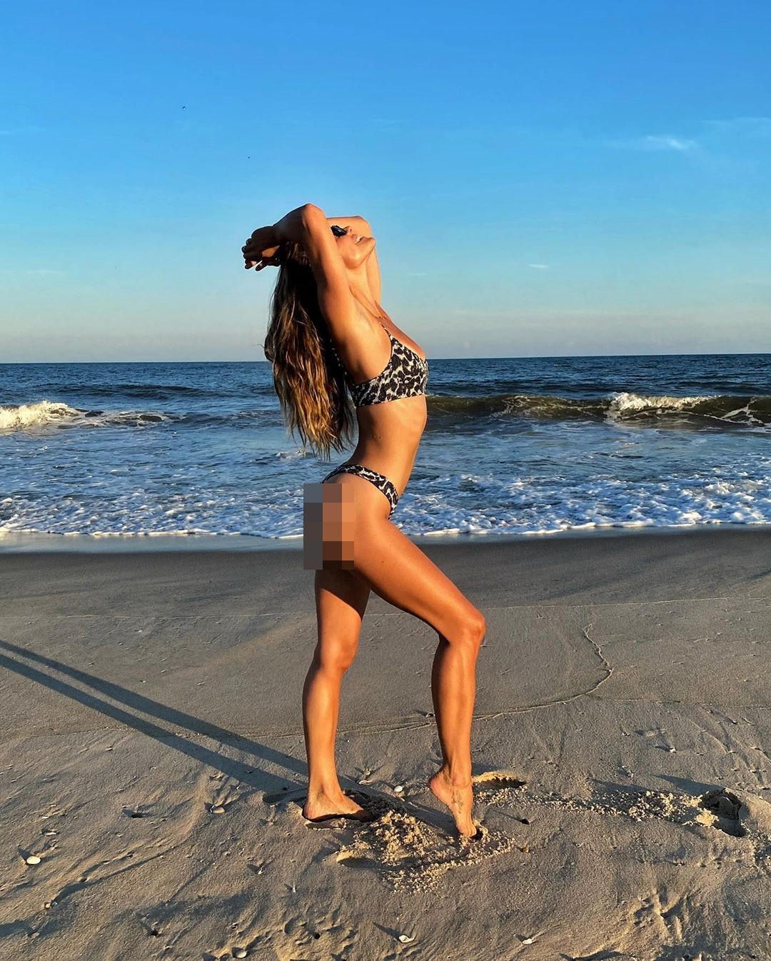 Rạng ngời trên biển, táo bạo che ngực trần, Nina Agdal khoe body rám nắng khỏe khoắn rực lửa với vòng eo thon phẳng lì.