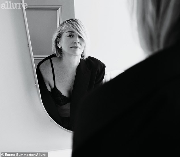 Sharon Stone diện vest lấp ló áo ngực trên tạp chí Allure số mới.