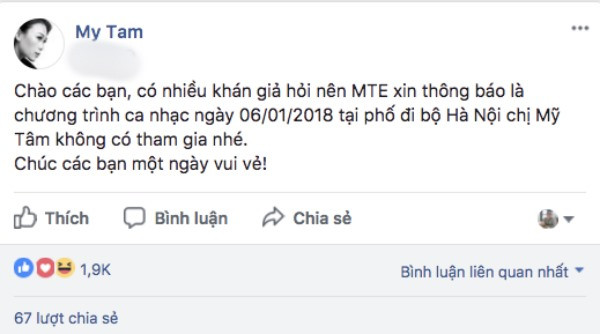 Tuy nhiên, động thái này có vẻ muộn màng khi phía Mỹ Tâm bất ngờ đăng đàn thông báo sẽ không xuất hiện biểu diễn trong đêm nhạc này. Đại diện nữ ca sĩ chia sẻ: “Vì có quá nhiều khán giả phản hồi, thắc mắc nên chúng tôi xin thông báo rằng, Mỹ Tâm sẽ không tham gia đêm nhạc ngày 6/1 tại phố đi bộ Hà Nội”.