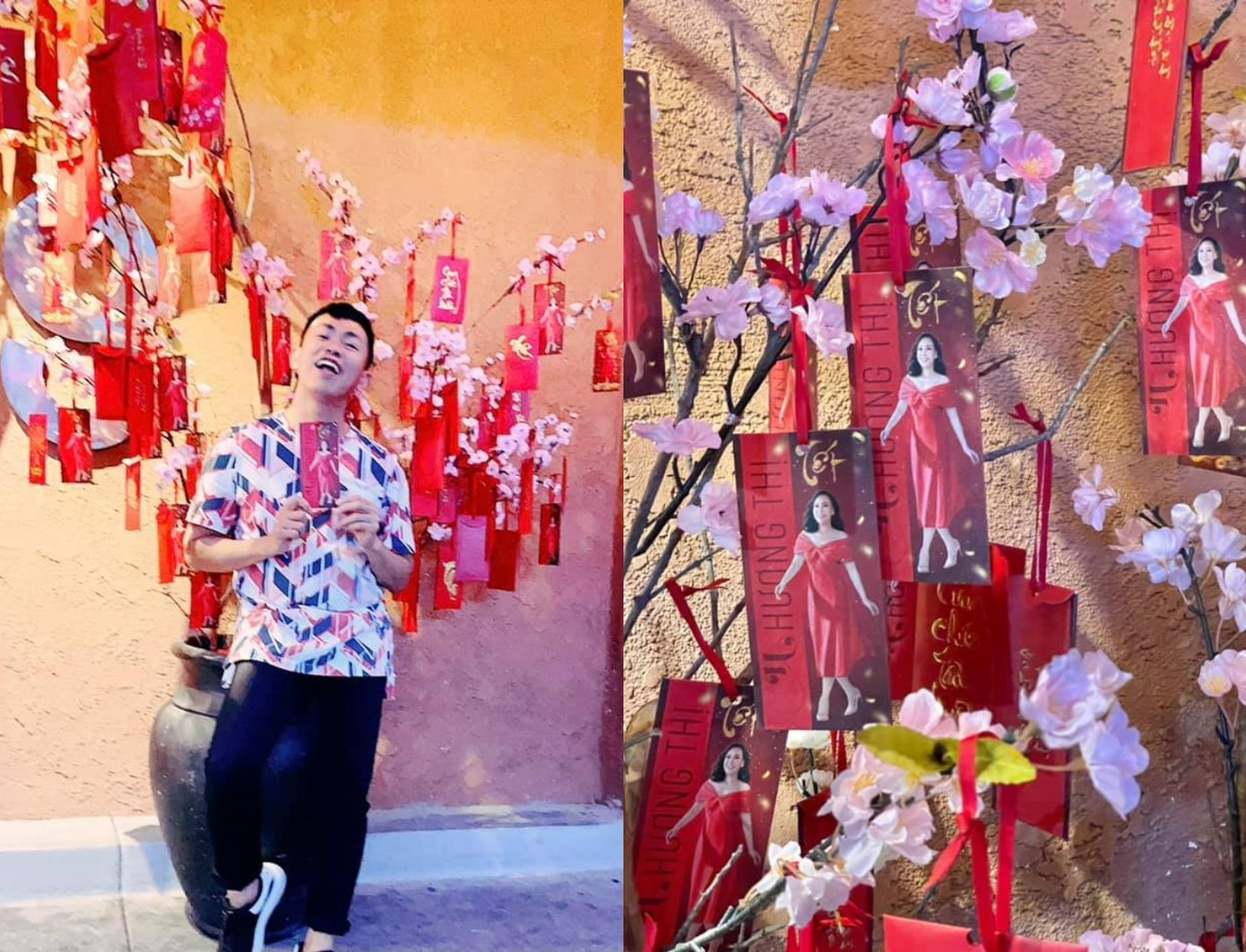 Hoài Tâm hào hứng khoe bao lì xì có in hình của danh hài Việt Hương để chào đón các vị khách đầu xuân năm mới đến với nhà hàng do anh và nữ nghệ sĩ chung vốn làm ăn