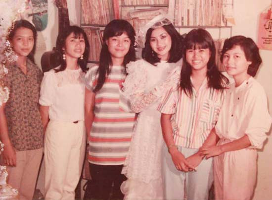 Ca sĩ Thanh Lam chụp ảnh cùng bạn bè trong ngày cưới với nhạc sĩ Quốc Trung. Được biết, đám cưới diễn ra dù không được gia đình nhạc sĩ Quốc Trung chấp thuận. Trong cuộc hôn nhân kéo dài 10 năm, hai người có với nhau hai người con, một nam và một nữ.