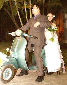 Ca sĩ Trần Thu Hà được chàng rước về dinh trên chiếc xe vespa cổ.