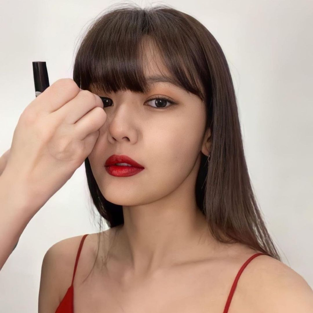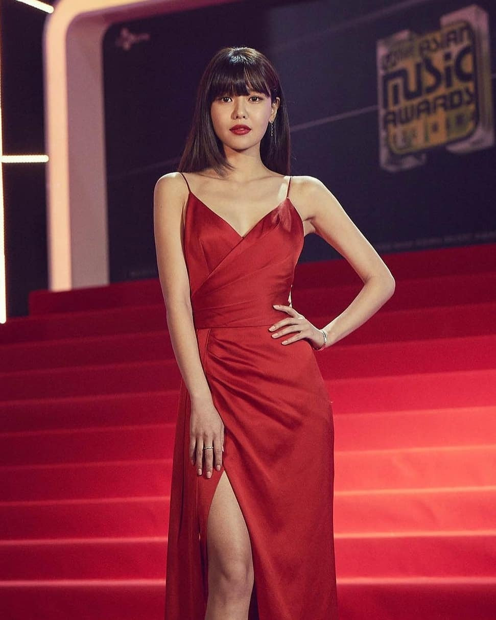 Nữ ca sĩ sinh năm 1990 diện đầm hai dây đỏ rực nổi bật với làn da trắng sứ.