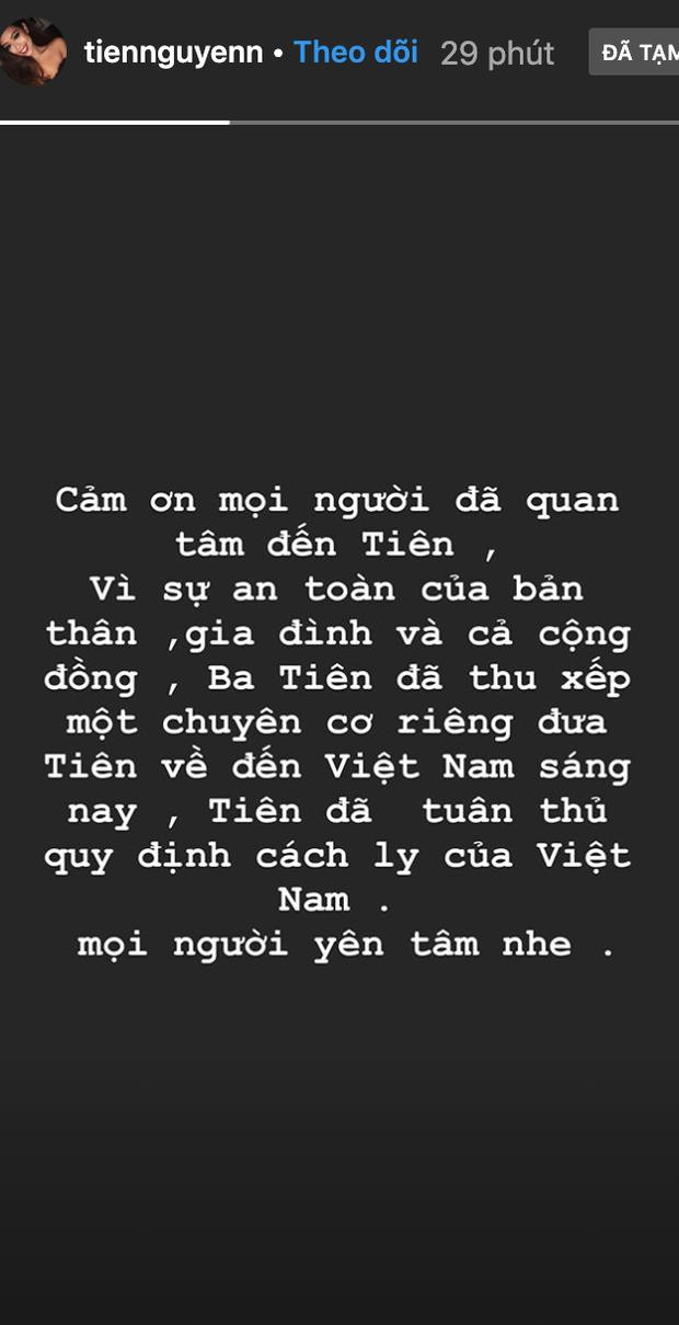 Sau khi N.H.N là bệnh nhân thứ 17 nhiễm Covid -19 tại Việt Nam được truyền thông đăng tải, trả lời Zing.vn, phía em chồng Tăng Thanh Hà cho biết cô vừa trở về TP.HCM vào ngày 9/3 và đã bị cách ly tập trung do từng có thời gian ở châu Âu cũng như tiếp xúc với bệnh nhân dương tính với Covid-19. "Tiên gặp N. ở Anh. Ngay sau khi có thông tin về dịch bệnh, Tiên đã đi khám bác sĩ và tự cách ly ở London, không về nhà ngay" - đại diện phía Tiên Nguyễn trả lời. Ngay sau khi có thông tin trên, Tiên Nguyễn đã lên tiếng trên trang cá nhân. Cô viết: "Vì sự an toàn của bản thân, gia đình và cộng đồng, ba thu xếp máy bay riêng đưa tôi về Việt Nam sáng nay. Tôi đã tuân thủ quy định cách ly của Việt Nam".