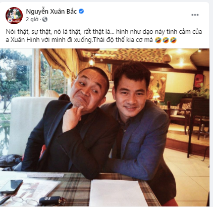 Mới đây, NSƯT Xuân Bắc chia sẻ bức hình cùng "vua hài" Xuân Hinh nhận nhiều chú ý từ khán giả. Cụ thể, Xuân Bắc tiết lộ: "Hình như thái độ của anh Hinh và mình đi xuống. Thái độ thế kia cơ mà". Dòng chia sẻ dí dỏm của diễn viên hài Xuân Bắc khiến nhiều khán giả thích thú. Thêm đó, nhiều fan phấn khích khi được gặp lại danh hài Xuân Hinh sau nhiều năm vắng bóng.