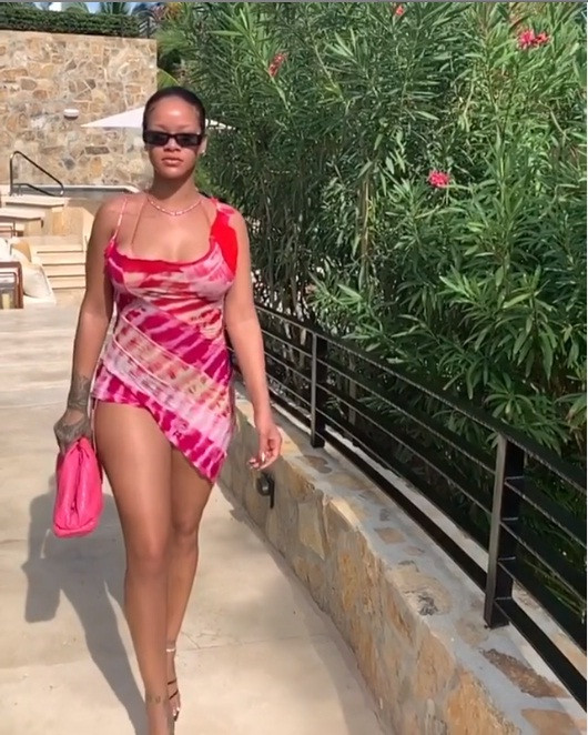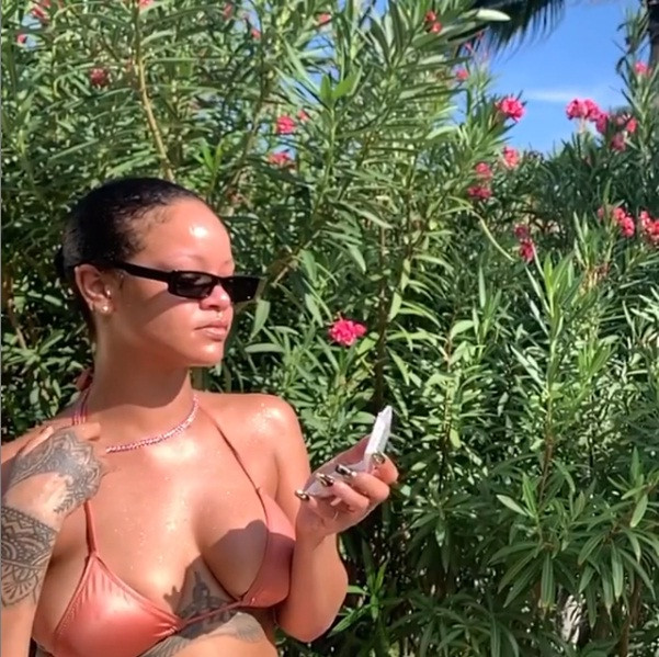 Mới đây, Rihanna chia sẻ loạt ảnh mới trên Instagram. Trong ảnh, nữ ca sĩ 31 tuổi mặc bikini bé xíu, khoác áo choàng hoa lá xanh - đen hoà mình trong làn nước bể bơi vào ban đêm.