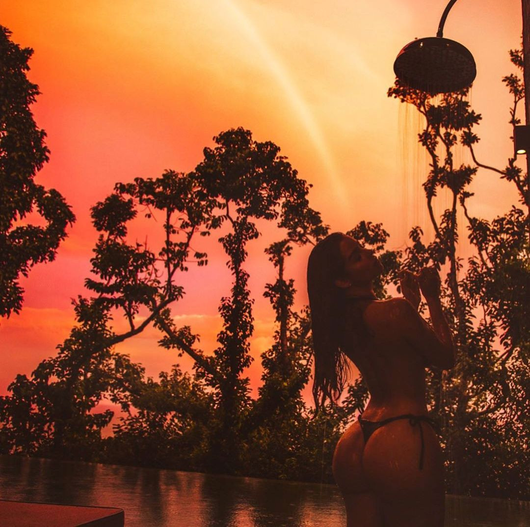Trong ảnh, người đẹp chỉ mặc mỗi quần bơi bé xíu, phô bày đường cong tinh tế, đặc biệt là "siêu vòng ba" trứ danh.