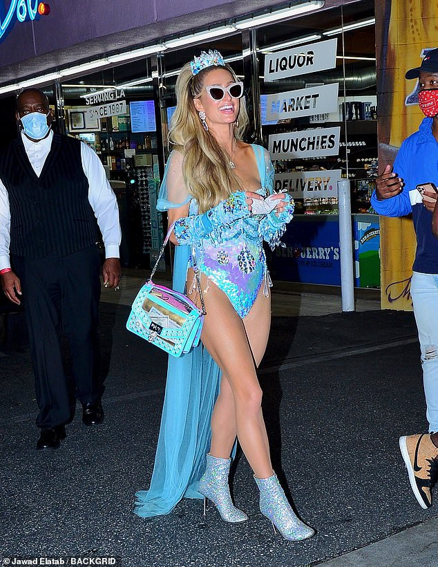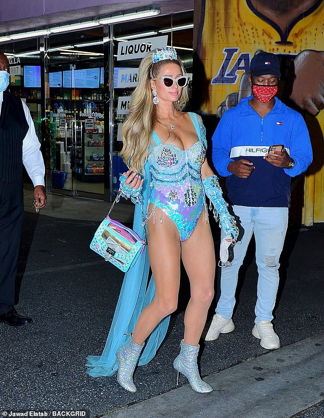 Paris Hilton đội vương miện công chúa, mặc bộ leotard như áo tắm khoe ngực đầy chân thon khi đến dự tiệc Halloween do nàng mẫu đắt giá nhất thế giới Kendall Jenner tổ chức cuối tuần qua ở Santa Monica.