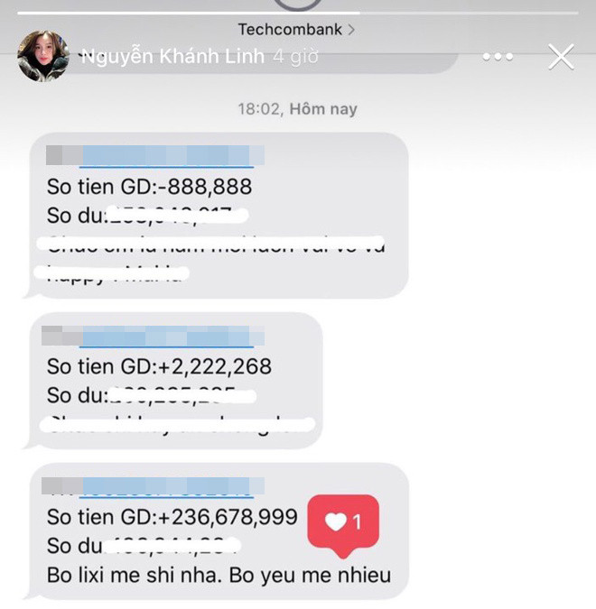 Cụ thể, theo hình ảnh được Khánh Linh đăng tải vào ngày 26/1 (mùng 2 Tết Nguyên đán) thì Bùi Tiến Dũng đã chuyển khoản cho vợ số tiền 230 triệu đồng kèm lời nhắn: "Bố lì xì mẹ Shi nha. Bố yêu mẹ nhiều".