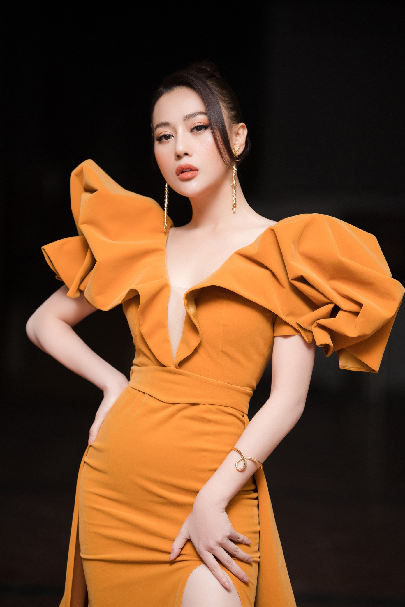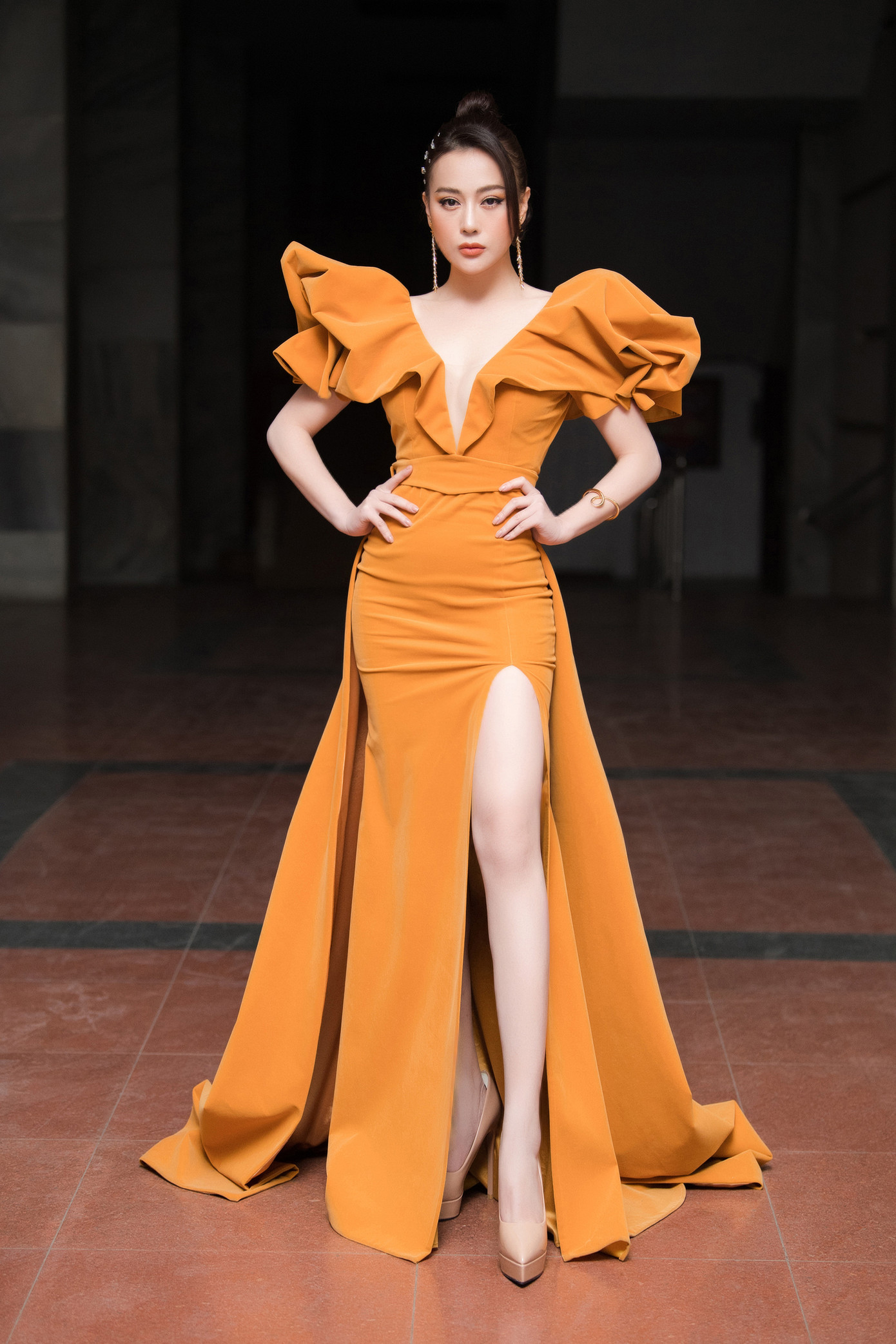 Cô diện bộ váy dạ hội màu vàng rực, khoe đôi chân thon dài gợi cảm.