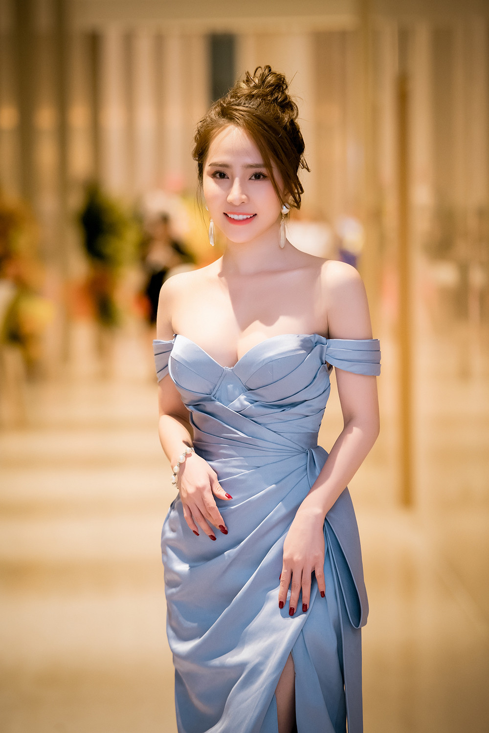 Quỳnh Nga thay hai bộ váy đều có thiết kế cúp ngực gợi cảm.