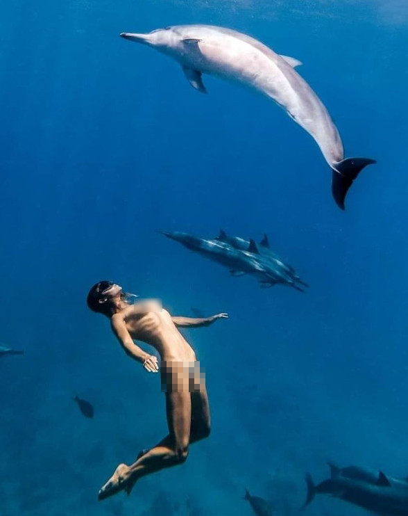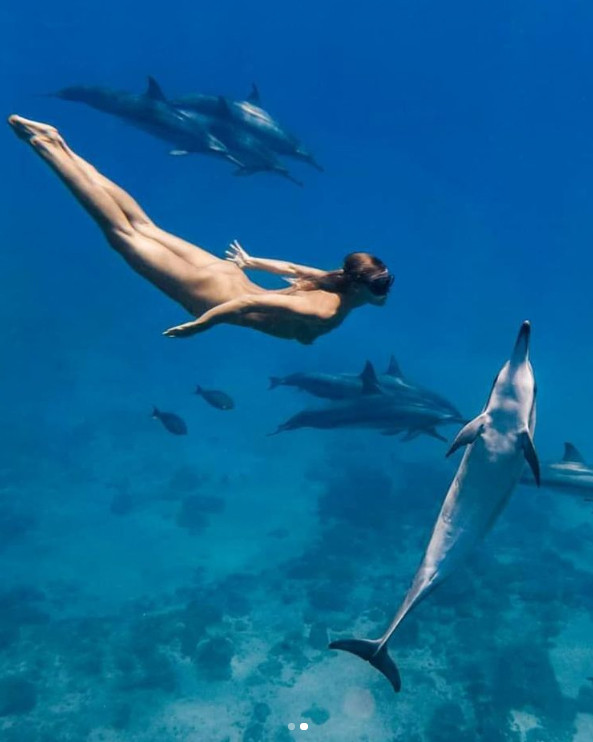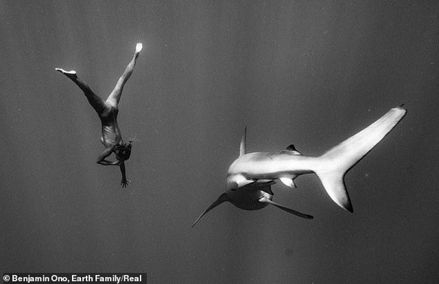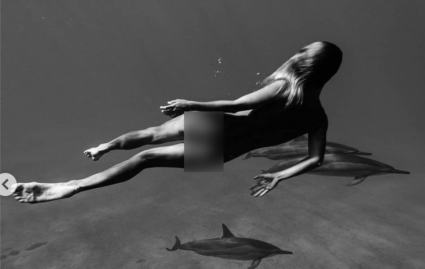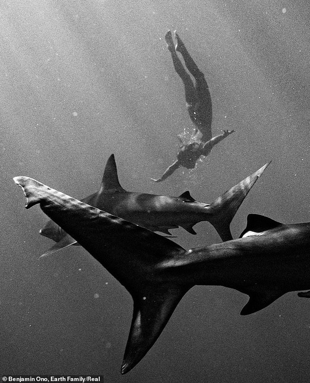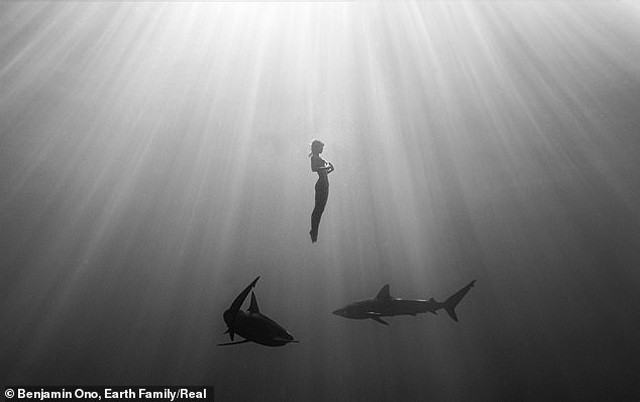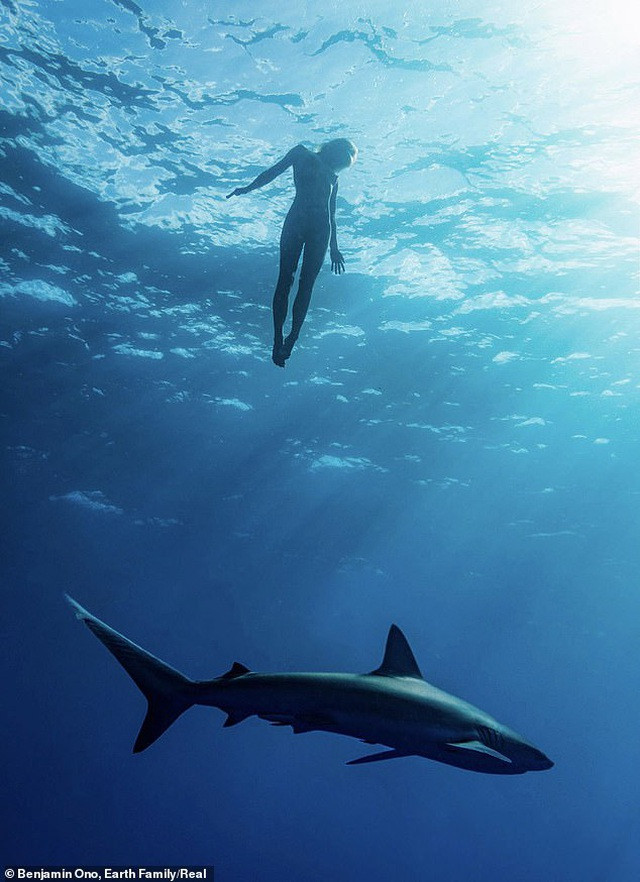 Trong hình, nữ người mẫu khỏa thân bơi giữa đàn cá mập mà không hề có một phương tiện bảo hộ nào.