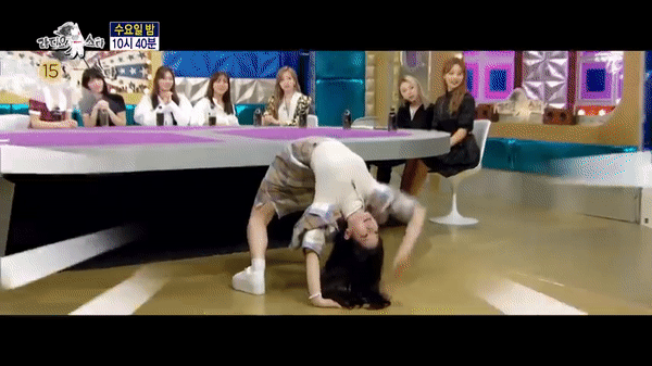 Không chỉ gây chú ý nhờ biểu cảm hài hước, Dahyun khiến cả trường quay kinh ngạc vì thực hiện động tác uốn dẻo độ khó cao. Đầu tiên, cô uốn mình theo tư thế bánh xe, sau đó xoay người 180 độ C và thoải thái giơ một tay tạo hình trái tim. Dàn MC thực sự sốc và hốt hoảng trước kỹ năng uốn dẻo “thần sầu” của nữ thần tượng 22 tuổi.