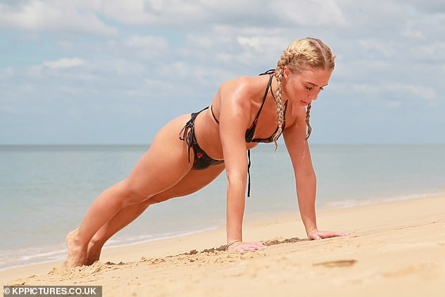 Không chỉ bơi, cô còn tập bài tập cơ tăng cường thể lực trên bãi biển.