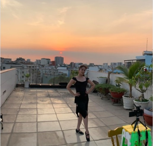 Phan Hiển làm “phó nháy” cho bà xã Khánh Thi thả dáng trên sân thượng vào chiều hoàng hôn.