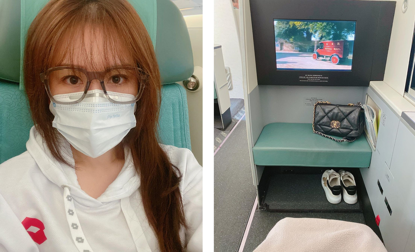 Hari Won không tháo khẩu trang dù đang ngồi trên máy bay rời Việt Nam sang Hàn Quốc. Cô còn để hash tag bằng tiếng Hàn nhắc nhở fans “sức khỏe là nhất” và “nên đeo khẩu trang”.