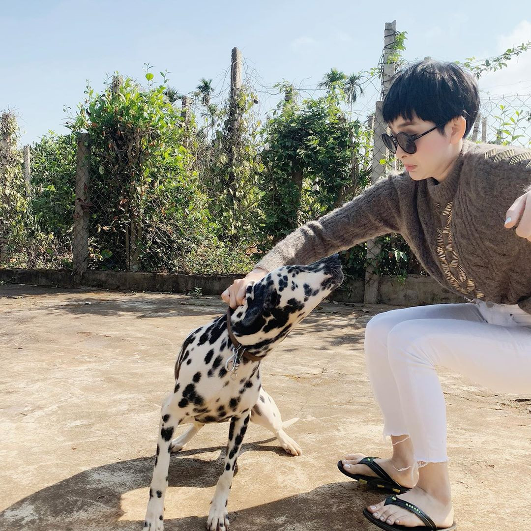 Hiền Hồ về quê trông chó nhưng bị chó dọa suýt ngã.