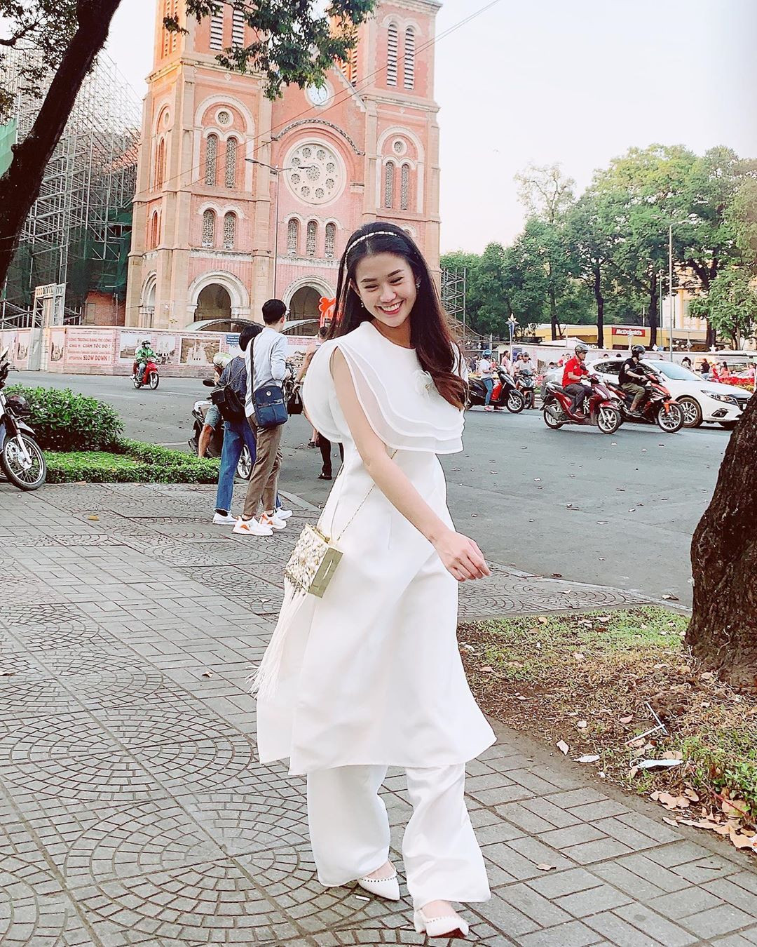 Ngọc Thảo xúng xính áo dài trắng muốt xuống phố, không quên “thả thính”: “Mùng 5 mới được mặc áo dài xuống phố! Còn mùng là còn Tết, hết mùng thì còn em”.