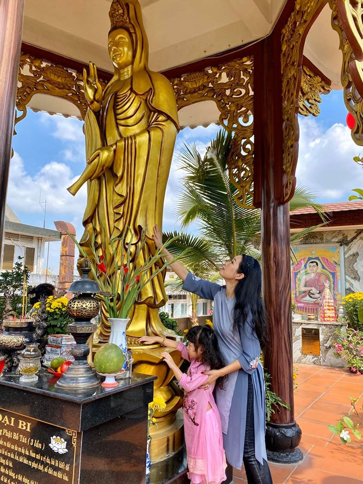 Á hậu Trịnh Kim Chi đi viếng chùa cùng con gái nhỏ.