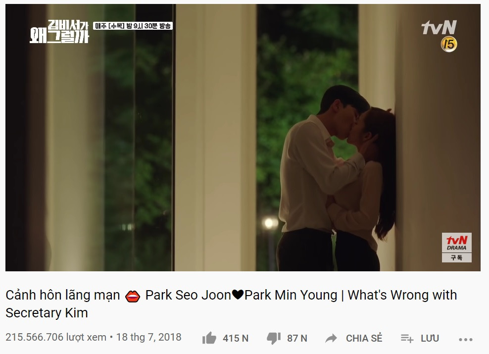 Chỉ sau một tháng ghi nhận con số 100 triệu lượt xem, cảnh hôn ướt át của “nam thần” Park Seo Joon và nữ diễn viên Park Min Young trong phim “Thư ký kim sao thế?” lại bất ngờ tăng vọt, nhanh hơn cả MV ca nhạc của một nhóm Kpop nổi tiếng. Cho đến lúc này, đoạn trích đã vượt qua con số 215 triệu lượt xem trên YouTube. Nhiều khán giả tỏ ra bất ngờ vì sau 2 năm, bộ phim vẫn thu hút được lượng người xem lớn như vậy. Dự đoán, với sự lan truyền mạnh mẽ trên internet, nhiều người sẽ tò mò nhấn vào xem, cột mốc 300 triệu view sẽ lại nhanh chóng đạt được trong thời gian ngắn tới