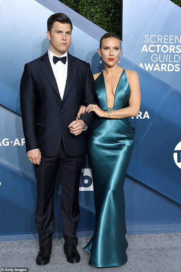 Sáng nay (20/1, giờ Việt Nam), Scarlett Johansson sánh đôi cùng vị hôn phu Colin Jost tham gia lễ trao giải SAG Awards tại Shrine Auditorium ở Los Angeles, Mỹ.
