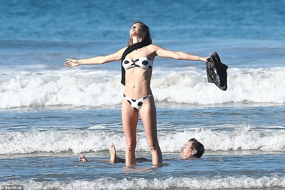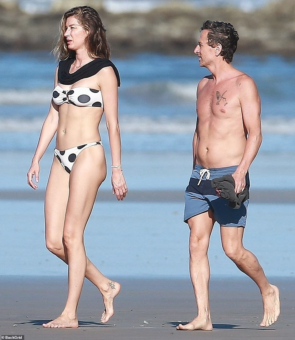 Gisele Bundchen được trông thấy mặc bộ bikini họa tiết chấm bi đen trắng đi tắm biển ở Costa Rica.